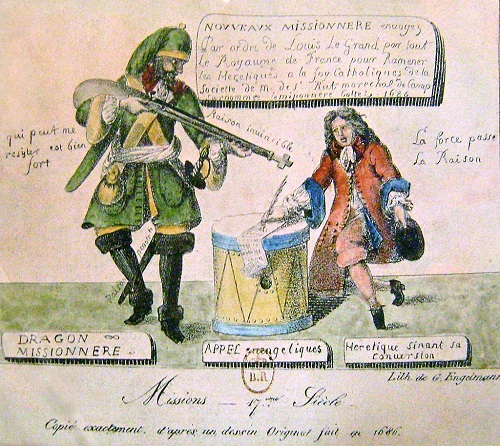 Ces exactions durèrent cinq ans. Dès 1680, l’intendant Marillac mena en Poitou une première opération restée tristement célèbre : on fit loger des dragons chez les protestants, en leur permettant toutes sortes de sévices. Les « missionnaires bottés »   obtinrent ainsi 30 000 conversions en quelques mois. Fort de ce bilan, Louvois fit étendre la mesure à toute la France. On présenta ainsi au roi de longues, d’extraordinaires listes de convertis. Ignorait-il les violences qui se cachaient derrière ? Crut-il alors que la révocation de l’édit de Nantes en 1685 ne serait plus qu’une simple formalité ?