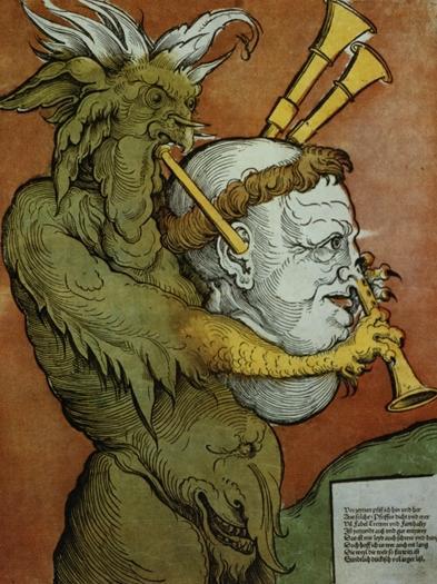 Cette célèbre caricature signée d’un peintre et graveur allemand est maintes fois reproduite. Elle représente Satan « jouant »   un moine comme s’il était une cornemuse. Deux interprétations existent.