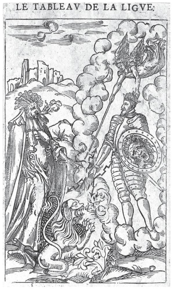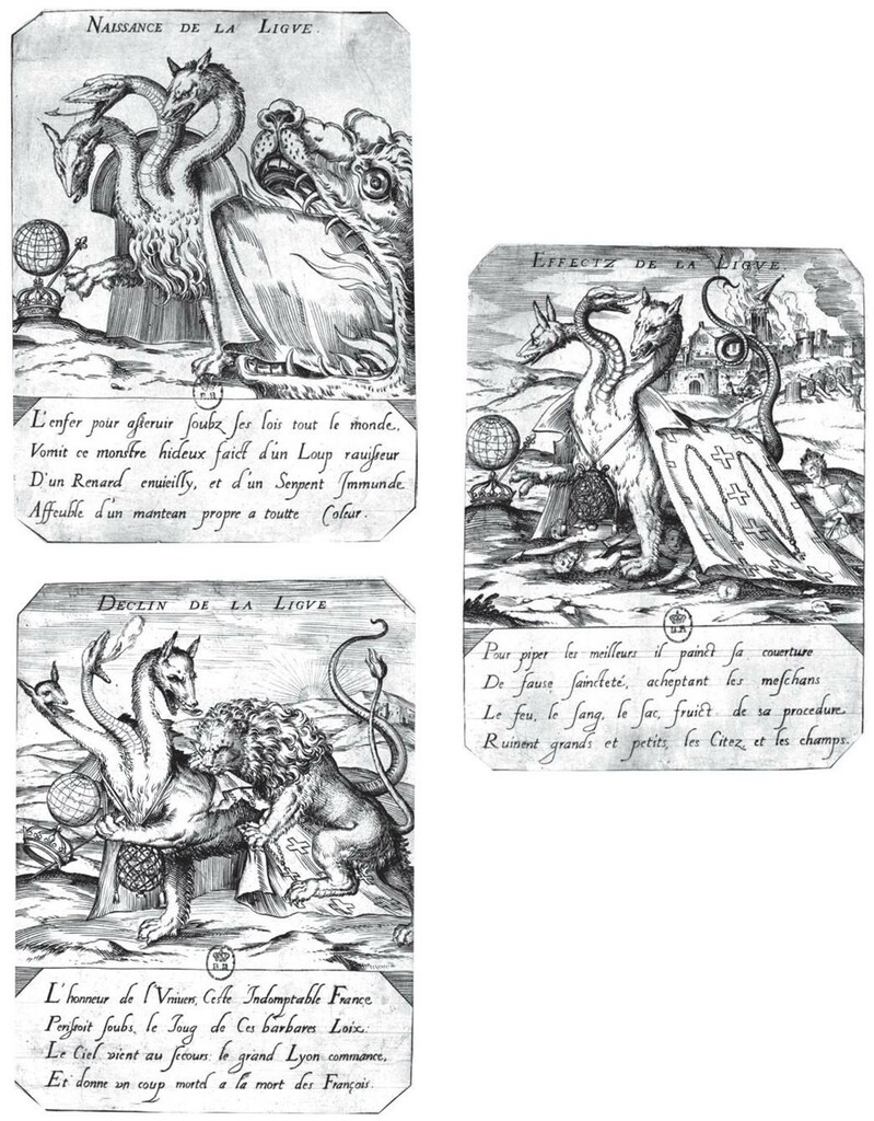 Anonyme, Histoire de la Ligue, trois estampes, année 1594 : Naissance de la Ligue. Effectz de la Ligue. Déclin de la Ligue, Paris, BnF.