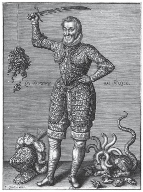 Ce tableau lui aussi contemporain (appartenant à la seconde école de Fontainebleau, vers 1605-1606) donne à voir un roi extraverti et bon vivant, athlétique et triomphant, représenté en empereur vainqueur d’ennemis dont il foule aux pieds les dépouilles, armures, casques, armes.