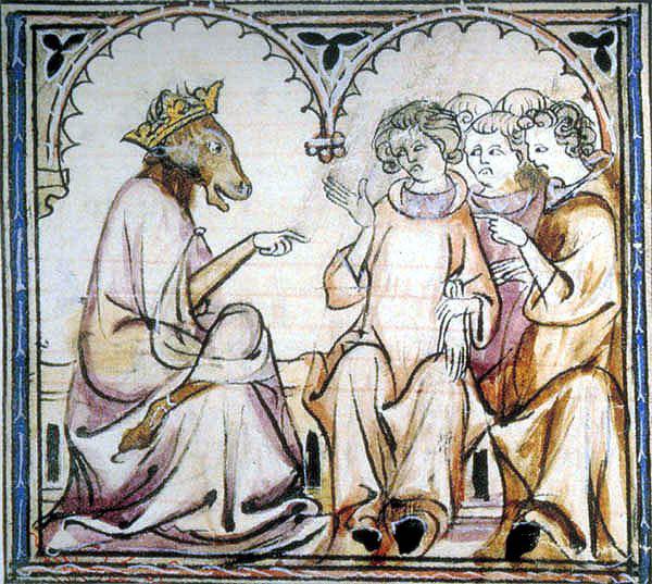 L’une des premières caricatures françaises apparaît à la fin du Moyen Âge dans un poème satirique contre le roi de France : Philippe IV le Bel (alias Maitre de Fauvel) prend la forme d’un âne méchant et pervers – les six lettres de « Fauvel »   étant les initiales de six vices : Flatterie, Avarice, Vilenie (U et V facilement confondus en calligraphie), Variété́ (Velléité́ synonyme d’inconstance), Envie, Lâcheté́.