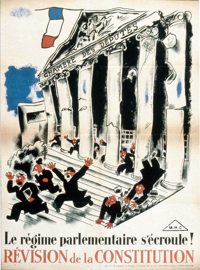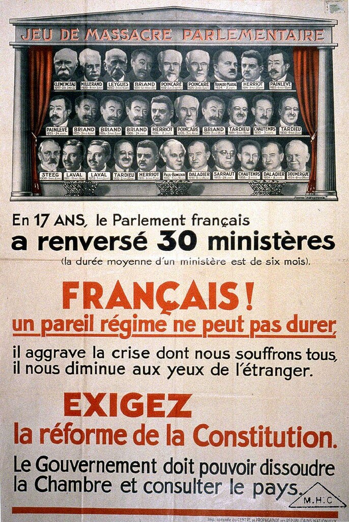Le mode de scrutin proportionnel, qui induit un émiettement de la représentation, favorise l’instabilité gouvernementale. Les affiches participent de ce combat qui vaut à la violence politique d’opérer un retour en force, le 6 février 1934. Au lendemain de cette grave crise politique, la droite retrouve le pouvoir, mais se voit réduite à de nouveaux expédients. Le ministère Doumergue tombera en novembre 1934 après avoir une nouvelle fois tenté de réviser la Constitution, tentative restée vaine et qui sera la dernière de la Troisième République.