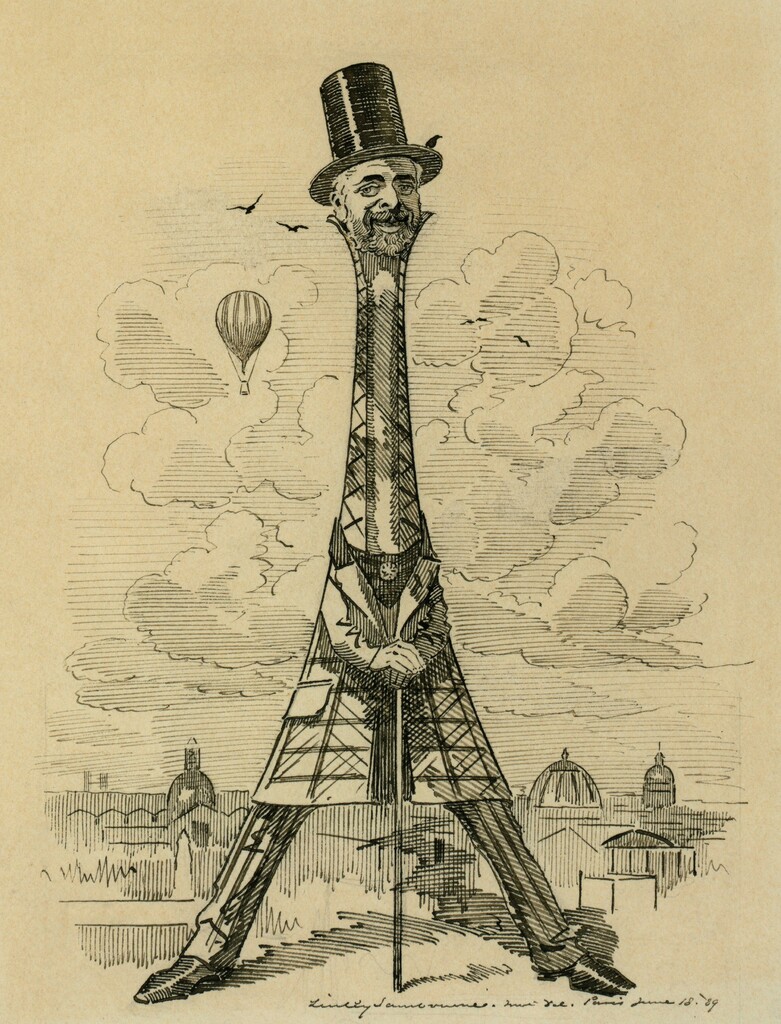Caricature de Gustave Eiffel en forme de Tour Eiffel, signée Edward Linley Sambourne (1844–1910) dans le magazine Punch, 29 juin 1889.