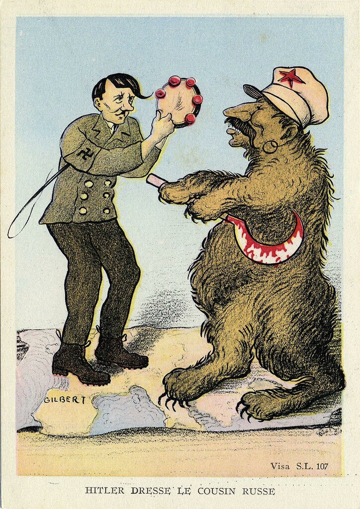 Même si la Russie communiste n’est plus l’allié de 1914, la perspective d’avoir à affronter l’Allemagne sans un soutien russe ouvrant un front à l’est effraie à juste titre. A l’instar de la carte postale « Hitler dresse le cousin russe » éditée entre fin août et septembre 1939, nombre de médias (illustrations, presse, radio, actualités filmées) reviennent très largement sur cet événement.