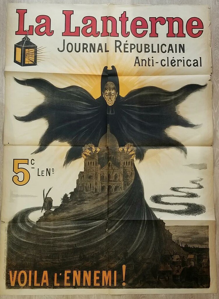 Cette étrange affiche en couverture de La Lanterne est surchargée de symboles ! Elle caricature à l’extrême l’adversaire : l’homme d’Église, sous les traits d’une chauve-souris géante, couvre de son ombre menaçante la « Ville lumière » privée de la clarté de l’astre solaire.