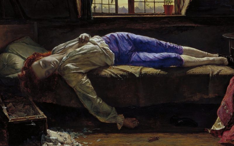 Chatterton reste dans l’histoire pour sa poésie, écrite sous le nom d’un moine du XVe siècle, Thomas Rowley. Il crée ce personnage, il fabrique son œuvre poétique dans un anglais médiéval, sur de faux manuscrits. L’illusion fonctionne si bien qu’il ne parvient plus à se défaire de son masque ! Venu à Londres pour y faire fortune, il se retrouve sans moyens suffisants d’existence. À la mort de son unique protecteur, il lutte quelques jours contre la faim et s’empoisonne à l’arsenic, préférant la mort à cette humiliation : il avait 17 ans, neuf mois et quatre jours.